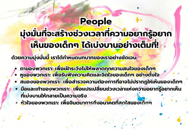 การนำเสนอการสร้างสรรค์ผลิตภัณฑ์และบริการที่มีส่วนช่วยส่งเสริมและต่อยอดความอยากรู้อยากเห็นของเด็กๆที่มีมาตั้งแต่กำเนิดให้พัฒนาได้อย่างเต็มศักยภาพจากการมุ่งมั่นค้นคว้าผ่านมุมมองของเด็กๆนั้นคือ จุดแข็งของเรา PEOPLE